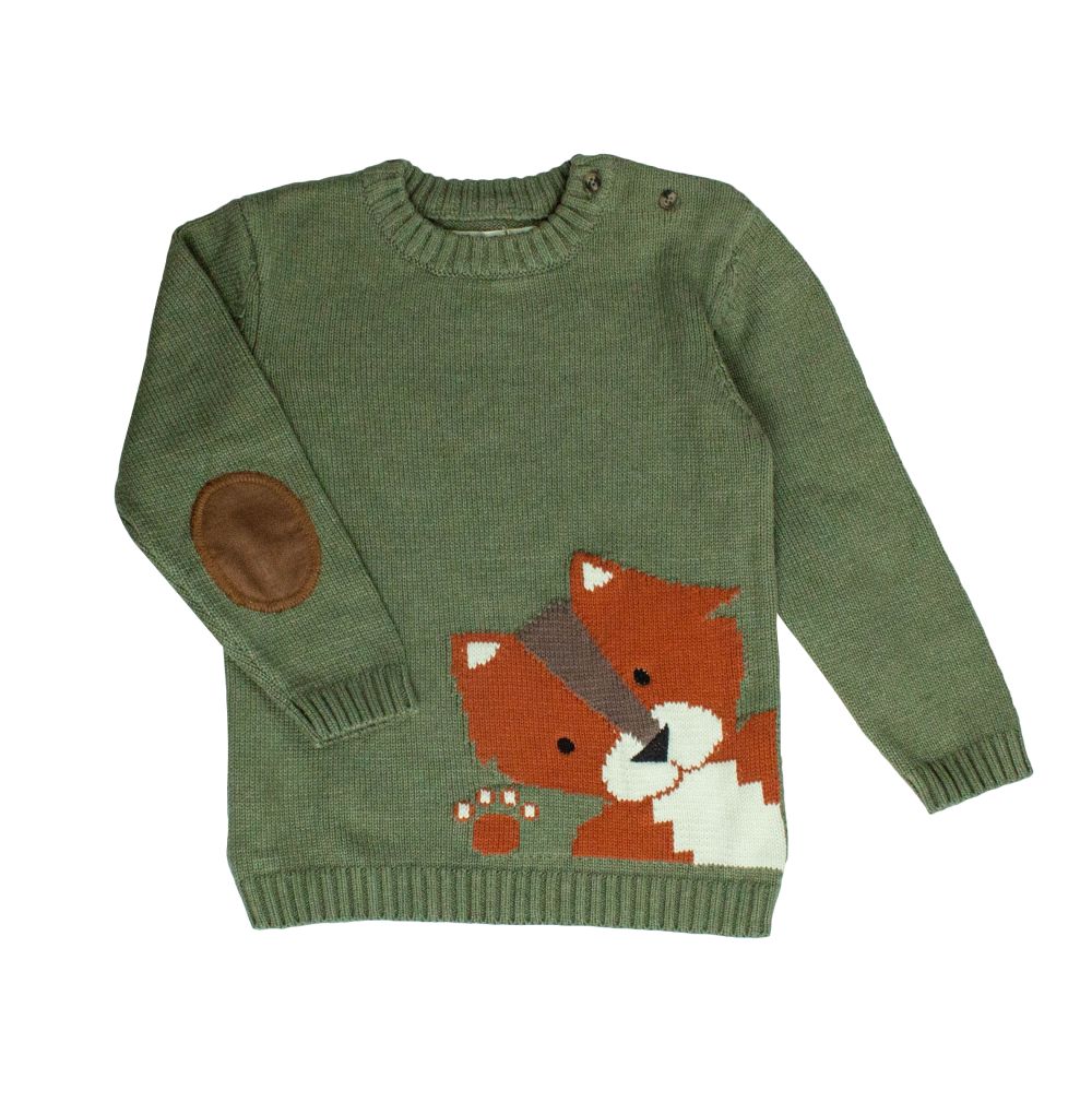 schöner Strick-Pullover von Sfera, Fuchs-Motiv, 2 Knöpfe auf linker Schulter, Ellenbogen-Patches